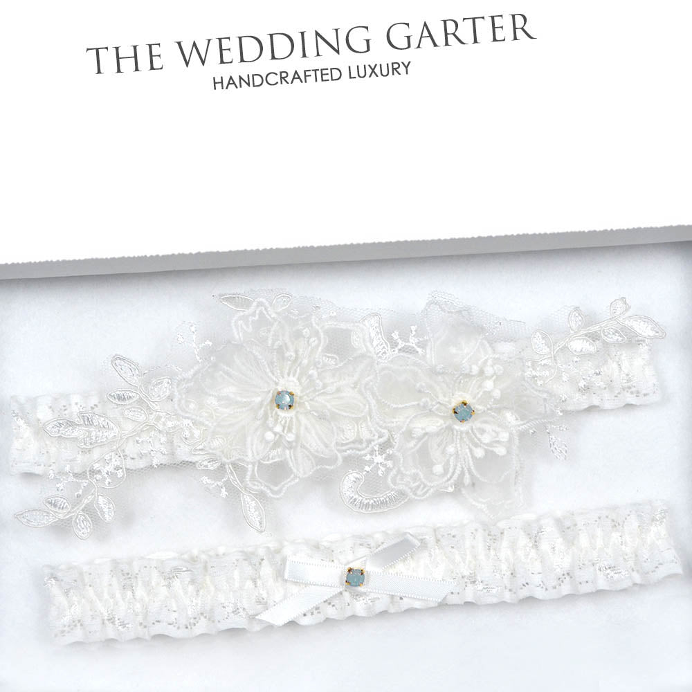 Our new season ivory lace wedding garter set for the modern bride to be is embellished with organza flowers, lace applique and cloudy opal charms. Made in pale ivory lace & soft lace band with elastic backing, this designer creation is a perfect match with any floral wedding dress. Adorned with a floral appliqué and opal crystal embellishments.